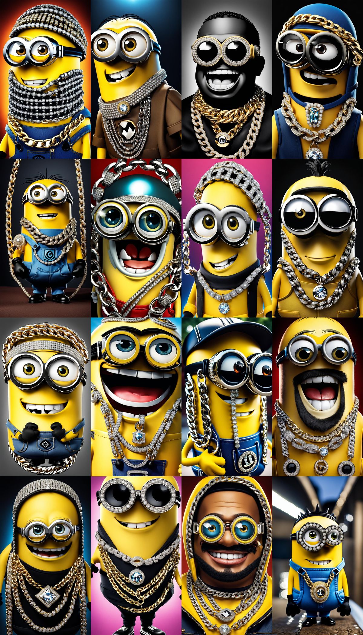 This image shows a minion rapper. It features exaggerated fisheye perspective, diamond jewelry, and stylized character design in a playful digital art style.