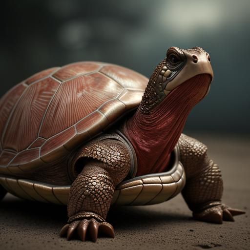 A hyperrealistic image of a turtle with a bronze and red spiked shell. The picture is highly detailed, with sharp focus, high contrast, and an atmospheric, cinematic mood.