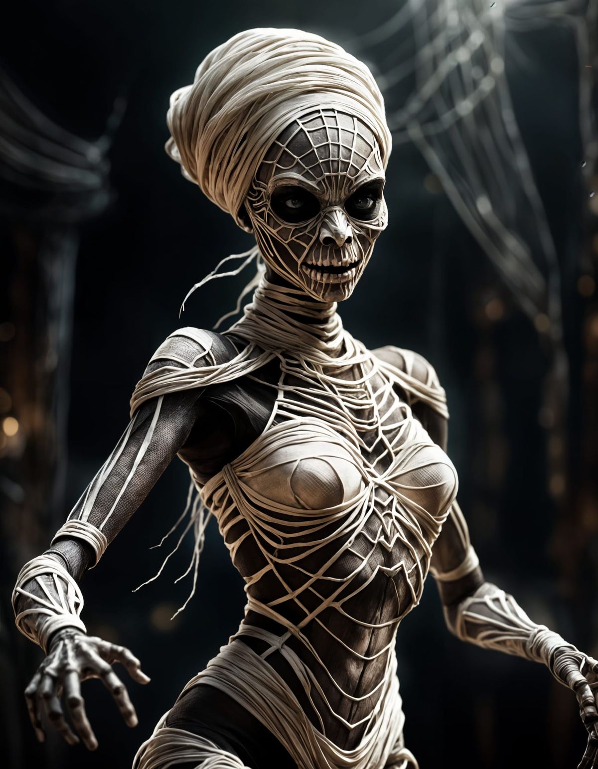 This image shows a stunning, intricately detailed digital matte painting of a female mummy composed entirely of white spider silk, presented in an epic, atmospheric cinematic style.