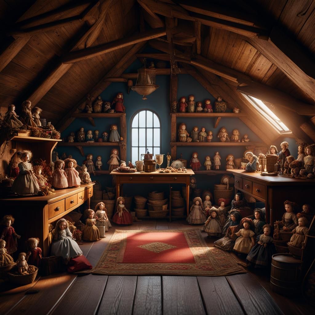 This image depicts an attic filled with antique dolls. The detailed matte painting features deep colors, intricate details, and complementary colors in a fantastical concept art style.