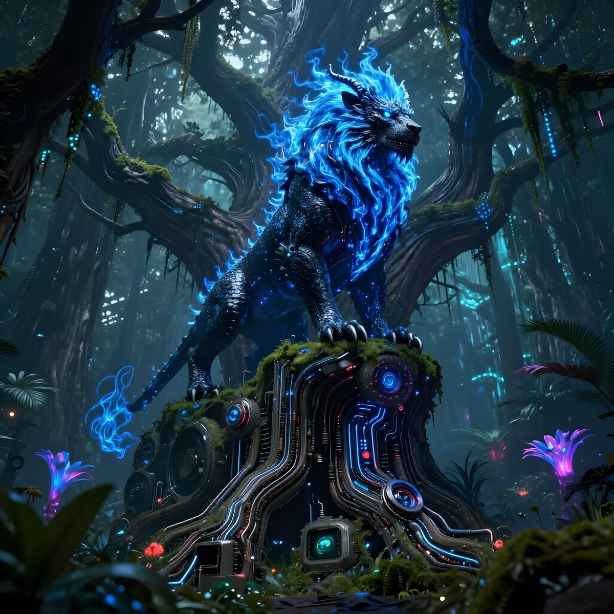 A striking image of a dragon-lion creature with obsidian scales and fiery mane, perched on a cybernetic tree in an alien jungle. Rendered in a vibrant, detailed sci-fi concept art style with dramatic lighting.
