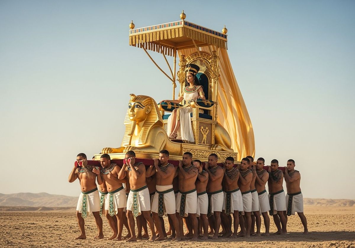 This image shows an Egyptian queen being carried on an elaborate golden throne by many servants. The queen is adorned in gold and emerald attire, and the scene is captured in a professional photograph with a shallow depth of field.