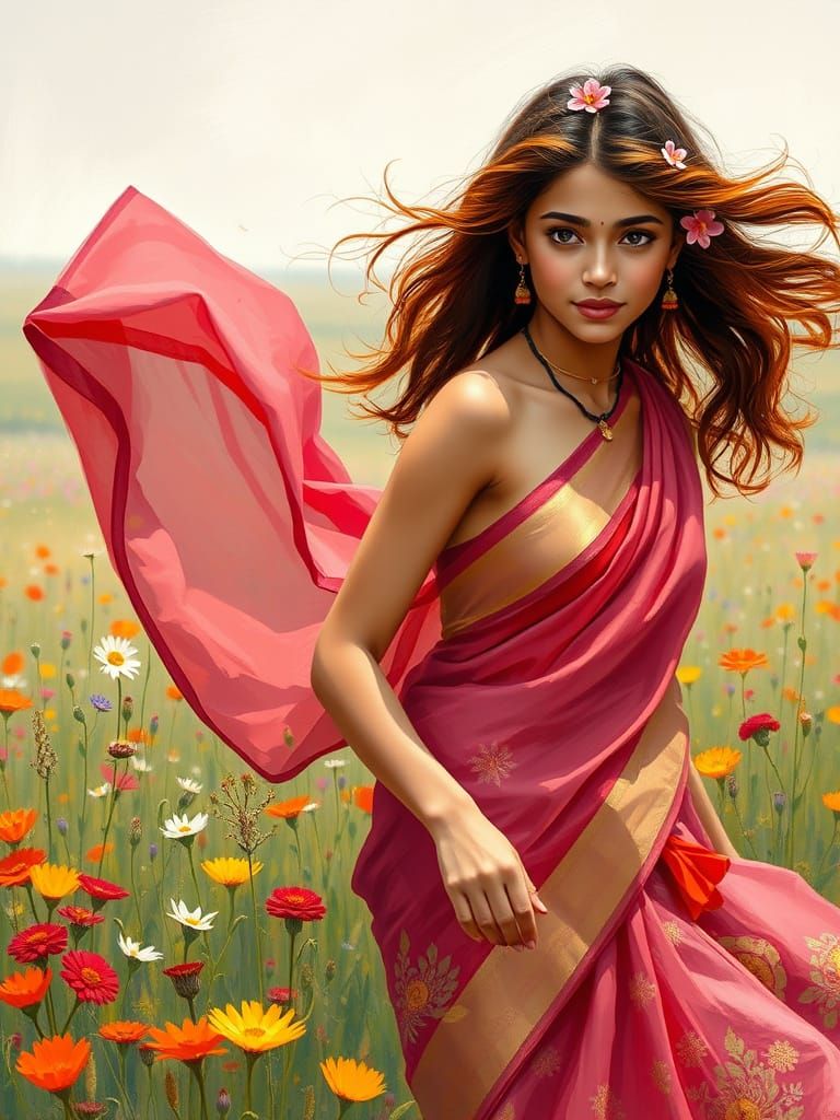 A young Indian woman with flowing auburn hair, adorned with jasmine flowers, stands in a field of vibrant wildflowers, her eyes sparkling with joy. She wears a traditional silk sari in shades of deep rose pink and gold, catching the sunlight as she twirls playfully. The air is filled with the scent of ...