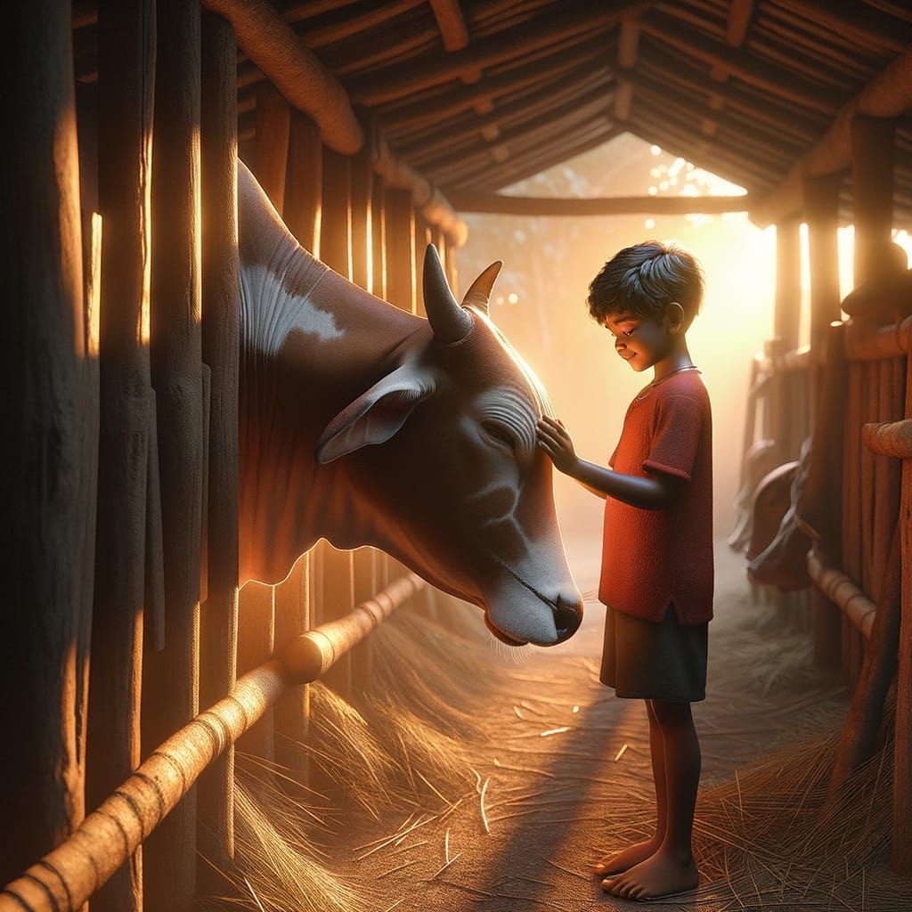 A peaceful image shows a young Bengali boy guiding a cow into its shed at sunset. Warm light streams through the wooden structure, creating a scene of contentment rendered with intricate detail and deep colors.