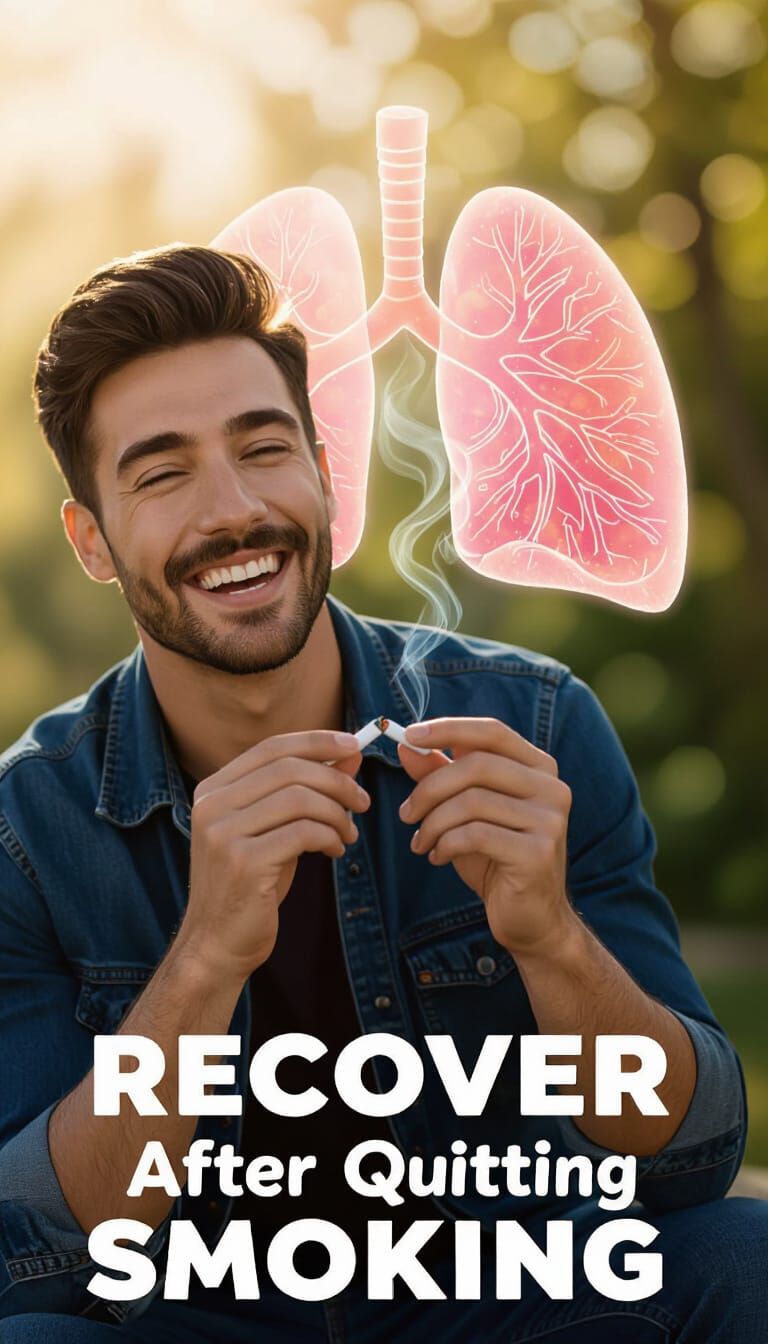 This image shows a smiling adult breaking a cigarette, with healthy lungs subtly illustrated behind. The watercolor-style overlay and warm lighting create an uplifting, painterly atmosphere. The text overlay promotes recovery after quitting smoking.