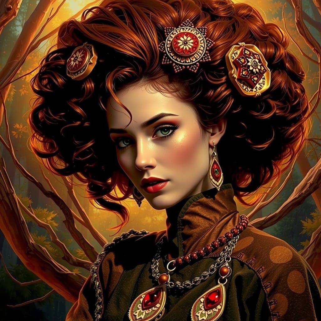 This image shows a woman with long auburn hair walking through a forest at twilight. Sunlight filters through the trees, creating a play of light and shadow. The scene is photorealistic.
