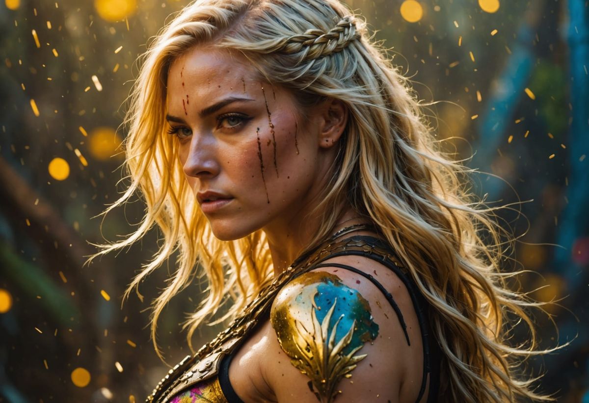 This image features an Amazon warrior with long blond hair in profile, wearing a gold crop top. Vivid colors and visible brushstrokes create a dynamic acrylic portrait.