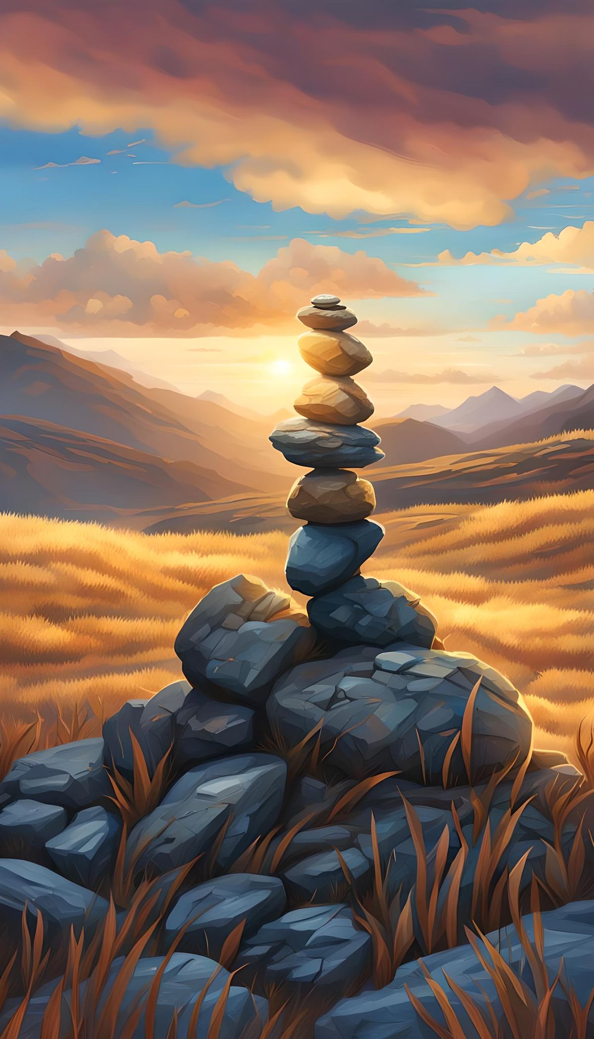 This image shows a meticulously crafted cairn of rocks standing tall on a grassy hilltop, set against a backdrop of distant mountains and a clear blue sky. The artwork is a detailed matte painting.