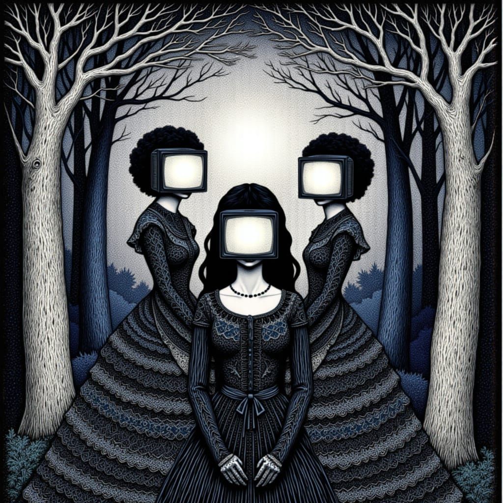 A haunting image of Victorian women in a misty forest, their faces hidden by vintage computers. Features a dark, surrealist, dystopian aesthetic with a monochromatic palette.