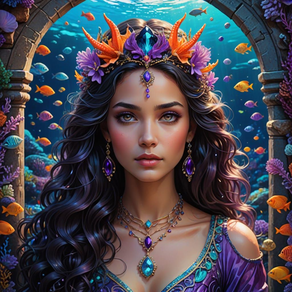 This image shows a close portrait of a Nereid goddess with dark hair and eyes, wearing a detailed purple gown and neckpiece. The vivid sea life background features a bejeweled underwater gate.