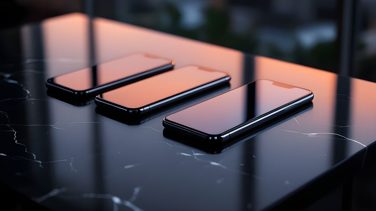 A high-resolution, hyperrealistic image showing four smartphones aligned on a black marble table at dusk. Ambient light illuminates the right side in this minimalist, high-contrast composition as comic book art.