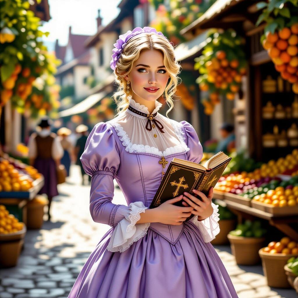 This image shows a blonde woman in a lavender Victorian ballgown holding a gold-embossed book. A sun-dappled medieval street with shops and merchants forms the backdrop.