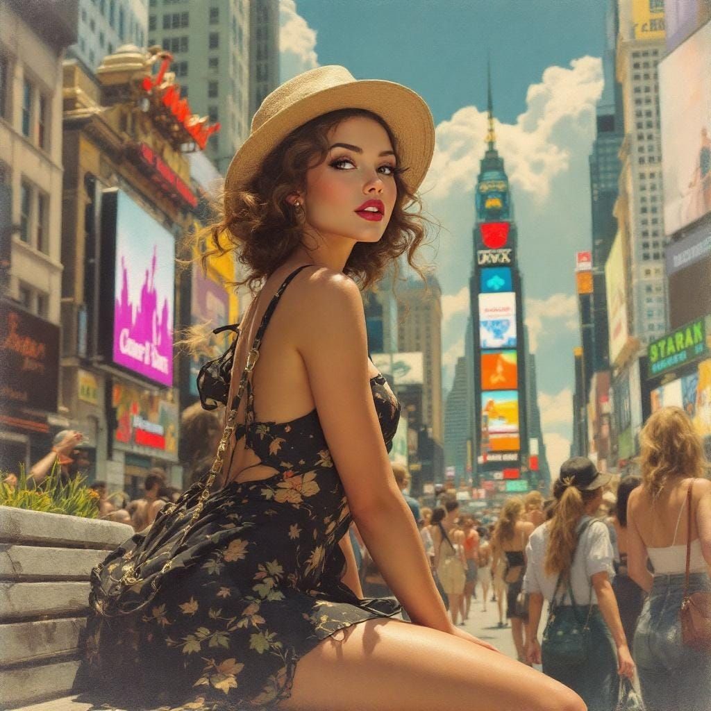 This image shows pin-up art in Times Square, New York, fused with solarpunk aesthetics. The artwork enhances traditional pin-up art with optimistic lighting techniques, dappled natural light, and iridescent highlights.