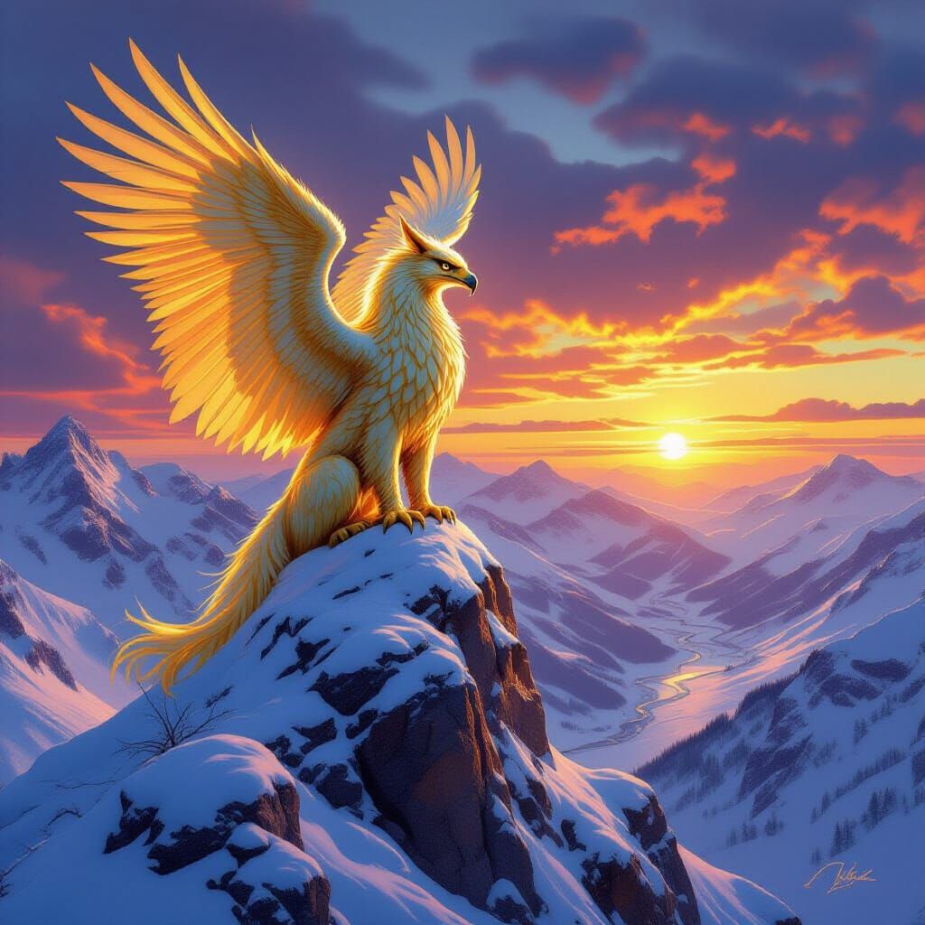 This image shows a golden griffin on a snowy mountain at sunset. The fantasycore artwork has iridescent feathers and wise eyes, watching over a frosted valley in a maximalist style.