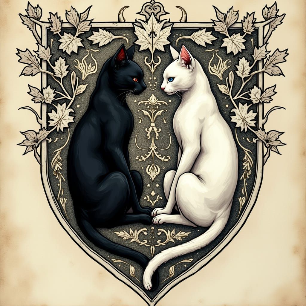 A medieval sigil featuring ornate filigree and white oak leaves. Elegant black and white cats are incorporated in an art nouveau style with gothic details.