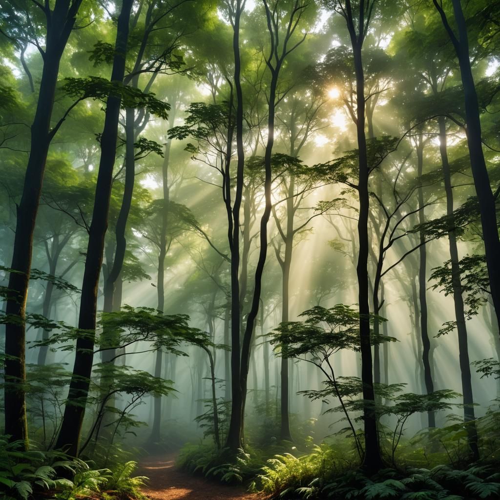 Imagine a misty forest at dawn, where rays of sunlight filter through the canopy, casting a soft glow on the lush greenery