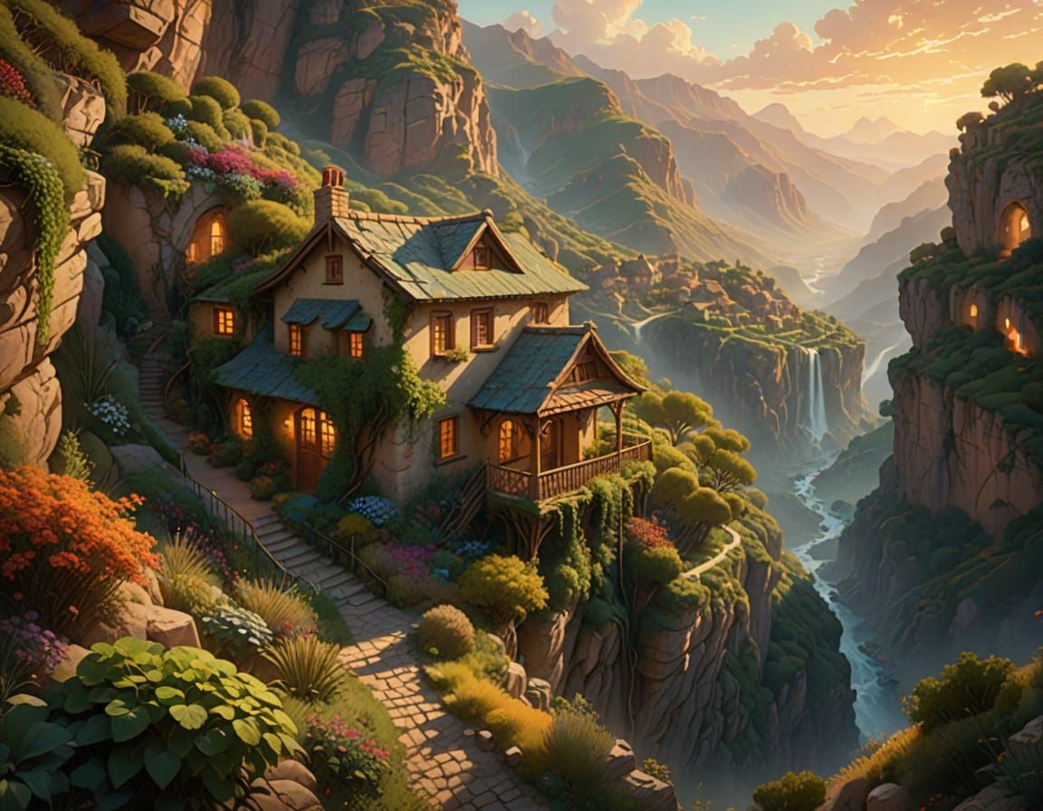 This image depicts a charming cottage nestled in a lush canyon, surrounded by vibrant colors, intricate details, and lush greenery, set against a mystical desert backdrop with warm golden light and a misty atmosphere.