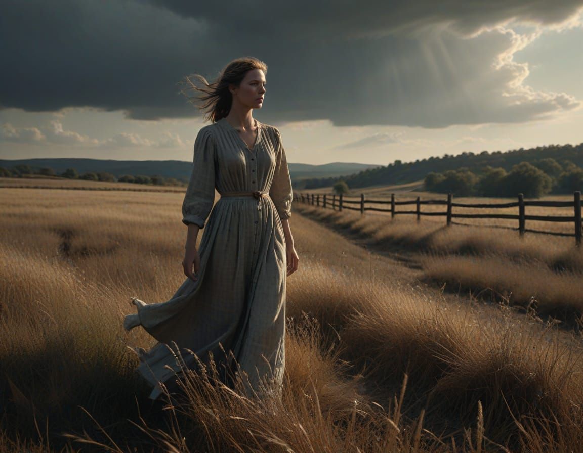 This image captures a young woman standing alone in a deserted field on a windy day, surrounded by the soft, muted colors of the earthy landscape, with a weathered wooden fence in the background, evoking a sense of classic rural Americana.