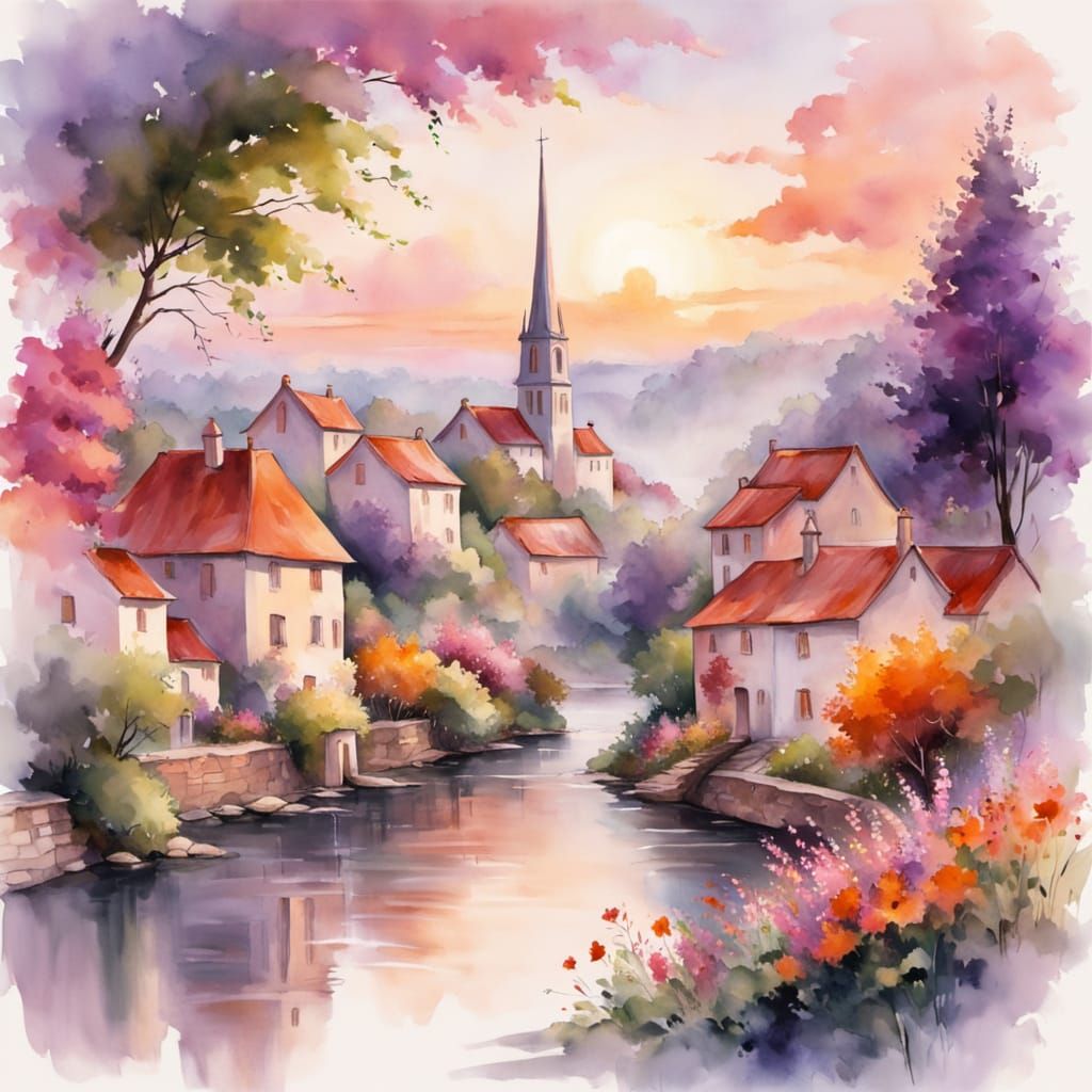 This image shows a serene village scene with light beige buildings and terracotta roofs, depicted in a realistic watercolor style with soft edges, capturing a tranquil and idyllic morning.