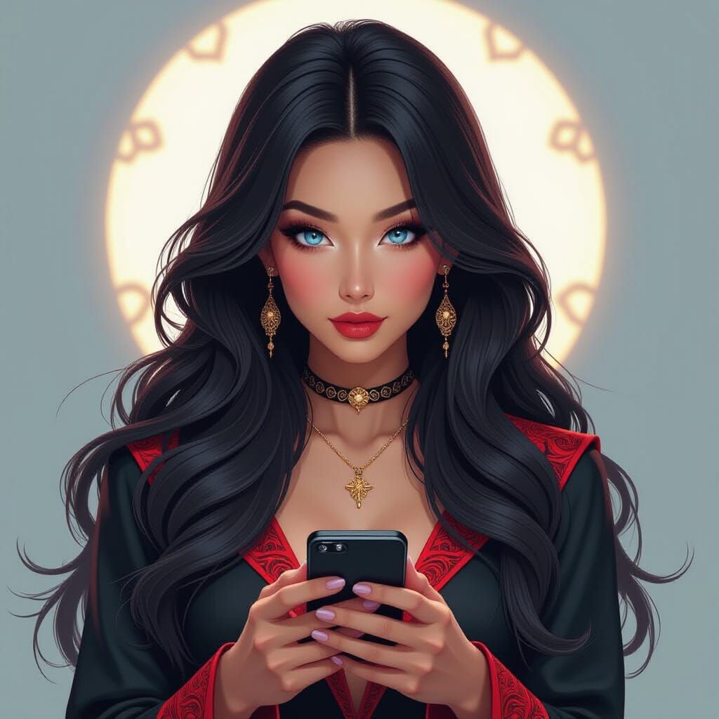 A hyperdetailed portrait of a Japanese and Cherokee woman with blue eyes, dressed in black and red, texting on her phone. Rendered with dynamic lighting and intricate detail in a concept art style.