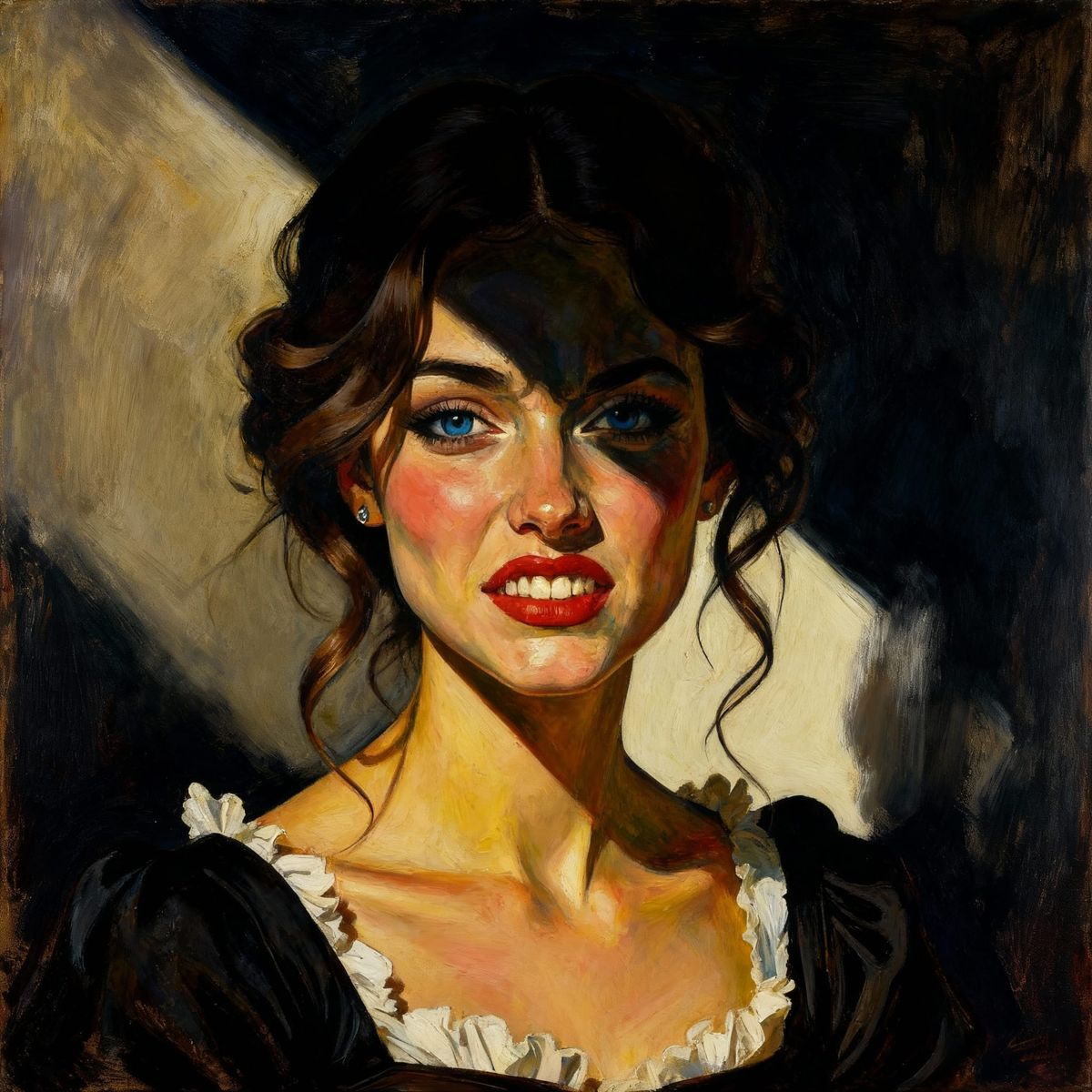This oil painting captures a woman's strained smile revealing hidden anger. Intense blue eyes and dramatic lighting create a powerful, emotional portrait in a dark, expressive style.