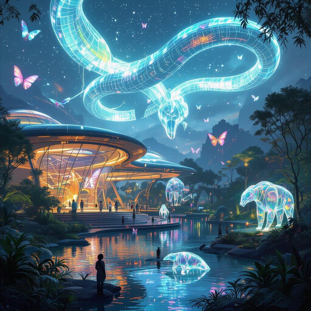 Experience a futuristic zoo pavilion filled with glowing sky-serpents, massive iridescent butterflies, and cybernetic creatures. Features surreal architecture and cinematic lighting, rendered in a concept art style.