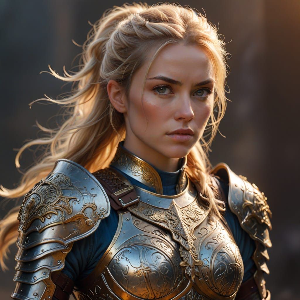 This image shows a determined blonde warrior in her late twenties, wearing ornate golden armor against a warm sunset gradient. Her blue eyes gaze forward with a heroic and inspiring expression.