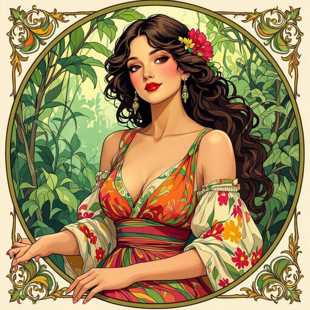 This image features a beautiful woman in vivid attire, set against a backdrop of abundant plant life. It showcases flowing lines and dreamlike qualities inspired by Art Nouveau and contemporary illustration styles.