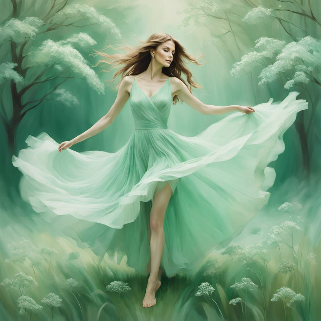 A graceful woman, reminiscent of a youthful Bridget Hall, dances barefoot on soft, pastel green grass. She wears a flowing dress crafted from delicate, waterhemlock-like petals, ethereal in nature, with jagged, sharp edges reflecting the plant's dangerous allure. The gown shifts with the breeze, its pale green and soft white tones blending with the surrounding ..."