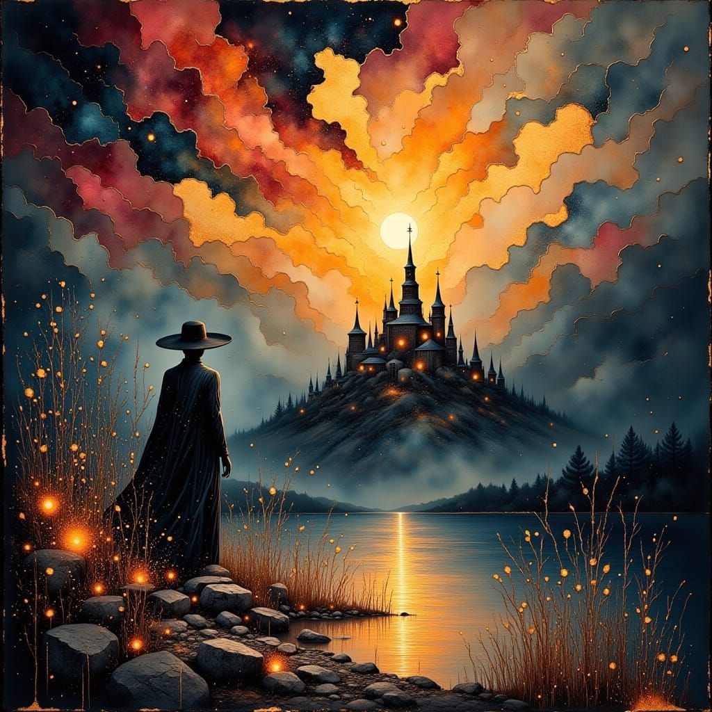 A surreal image of a domed church on a hill at dusk, reflecting a vibrant sunset. The scene features a bridge, fireworks, and a lone figure in silhouette, all rendered with a painterly, cinematic quality.