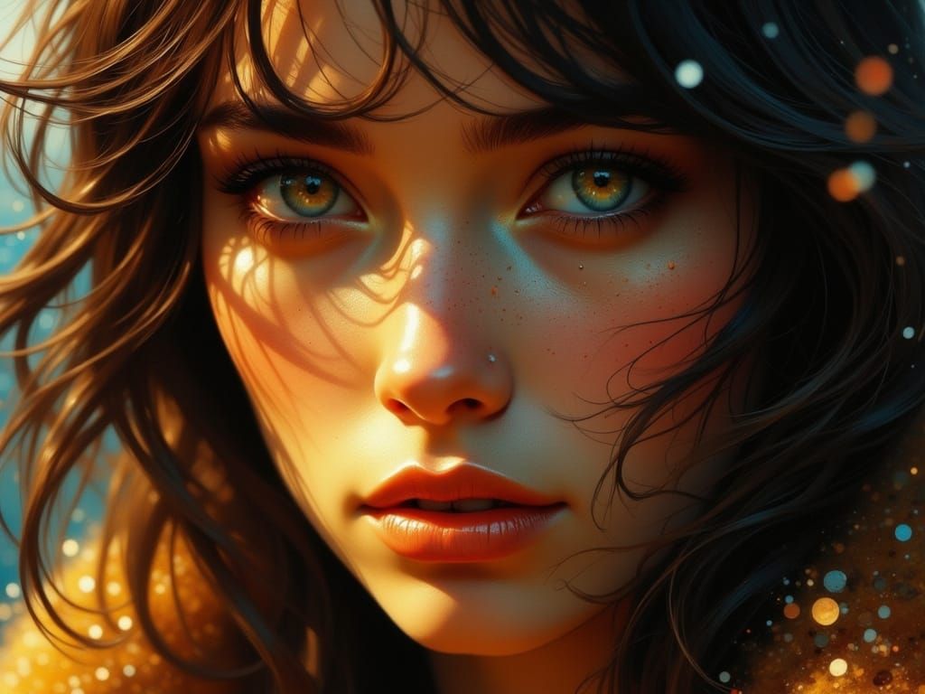 A high-resolution image of Gene Tierney as a final girl in a 2000s movie, rendered in a cracked impasto and jelly anime style with high contrast and sharp focus.