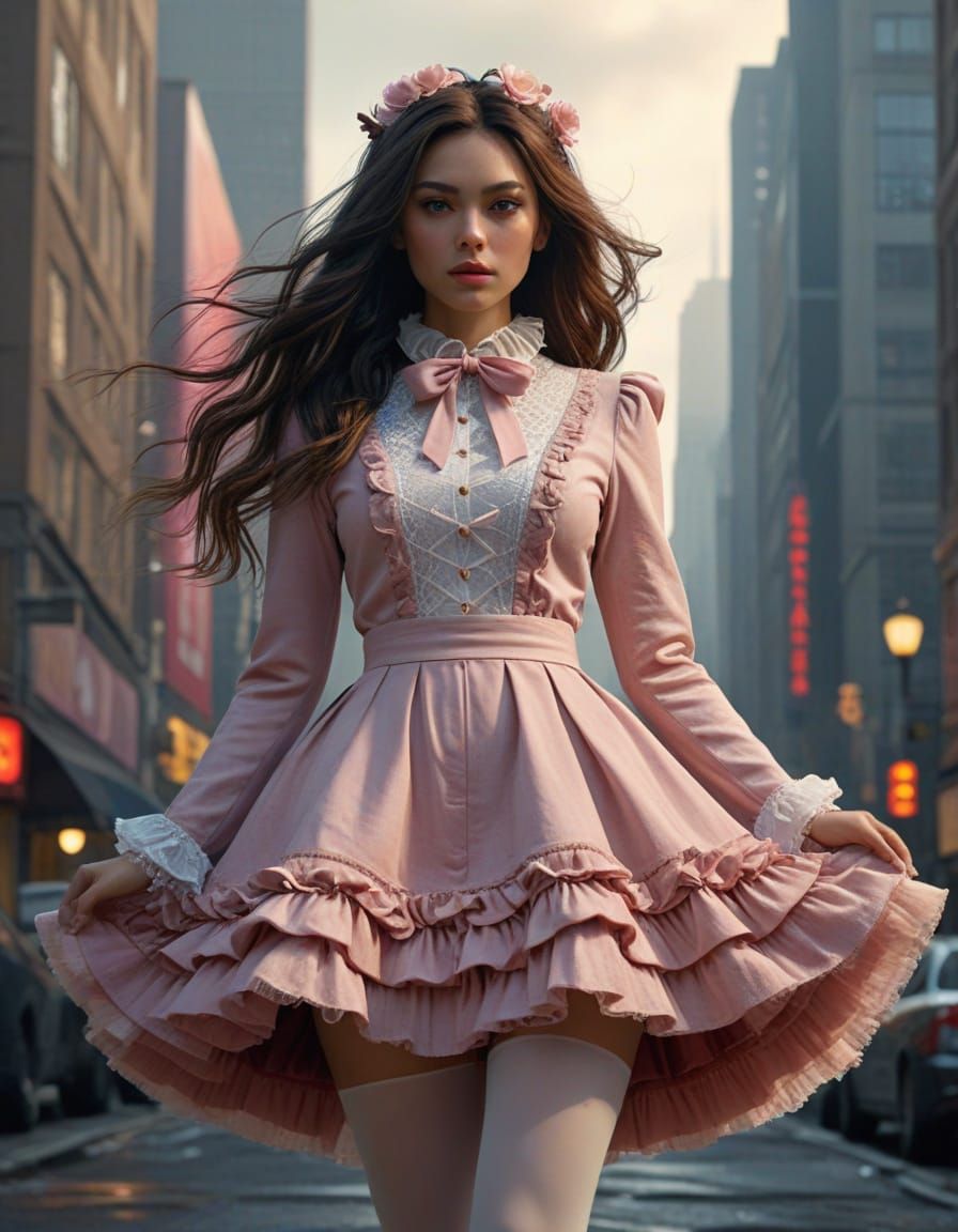 A striking picture of a cyberpunk goddess in a Detroit cityscape. This digital artwork features hyperdetailed textures, dynamic lighting and vibrant colors in a graphical realism style. The goddess wears a unique Victorian-Japanese style minidress.