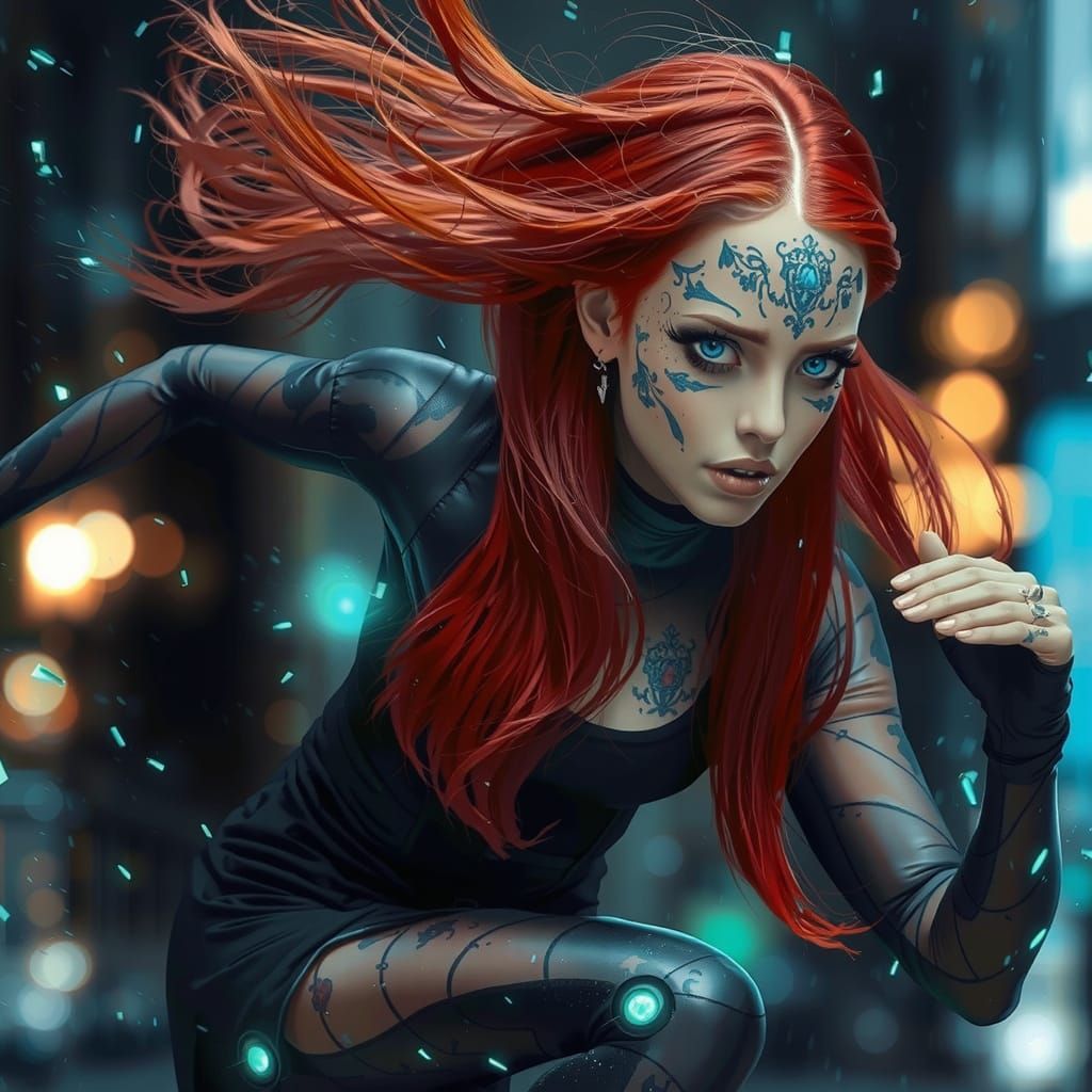 A mysterious figure darts across a dimly lit city street, arms outstretched, as cinematic lighting casts dramatic shadows on the wet pavement, with a moody atmosphere and bold colors.