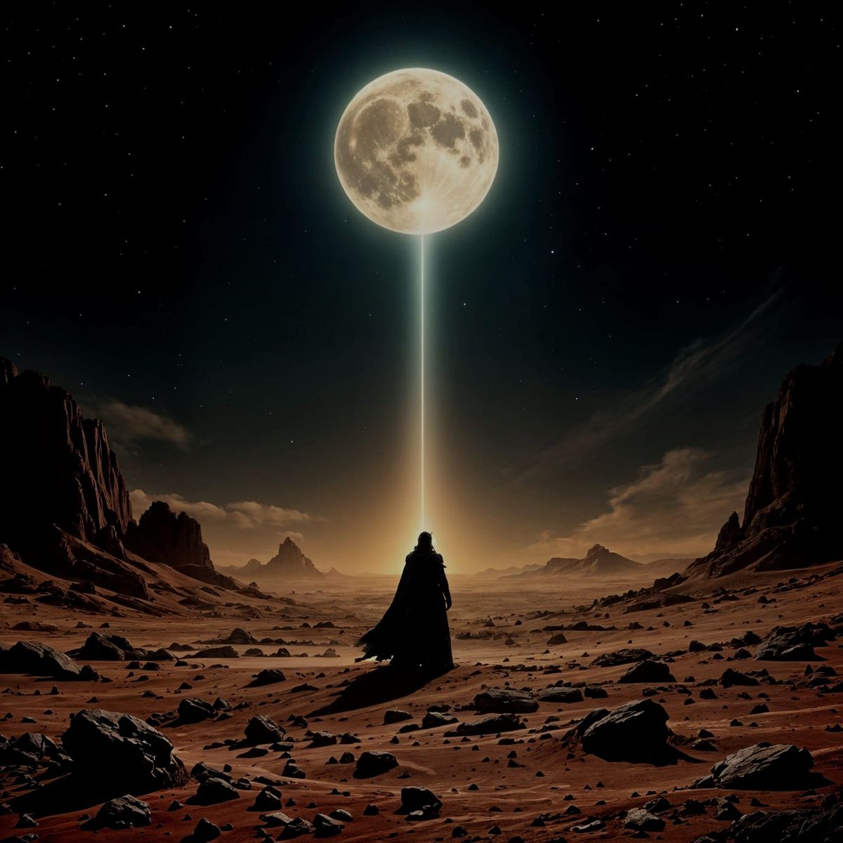 This image shows a lone knight standing in Mars' Cydonia crater under a dark, star-filled night sky. The scene is illuminated by an eerie glow, creating a haunting, cinematic sci-fi horror aesthetic.