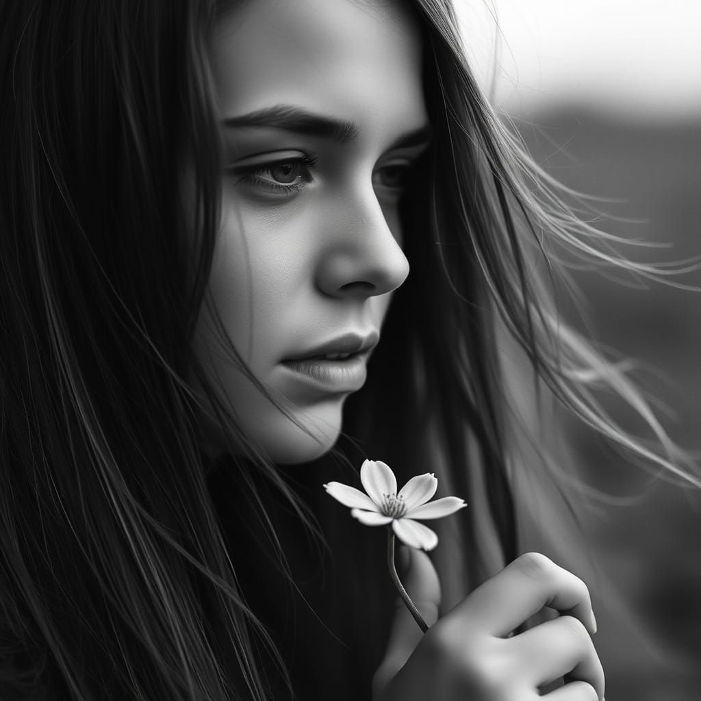 A serene black-and-white portrait of a woman with flowing hair, gazing thoughtfully into the distance while holding a flower. The soft light enhances the gentle, emotional atmosphere of the scene