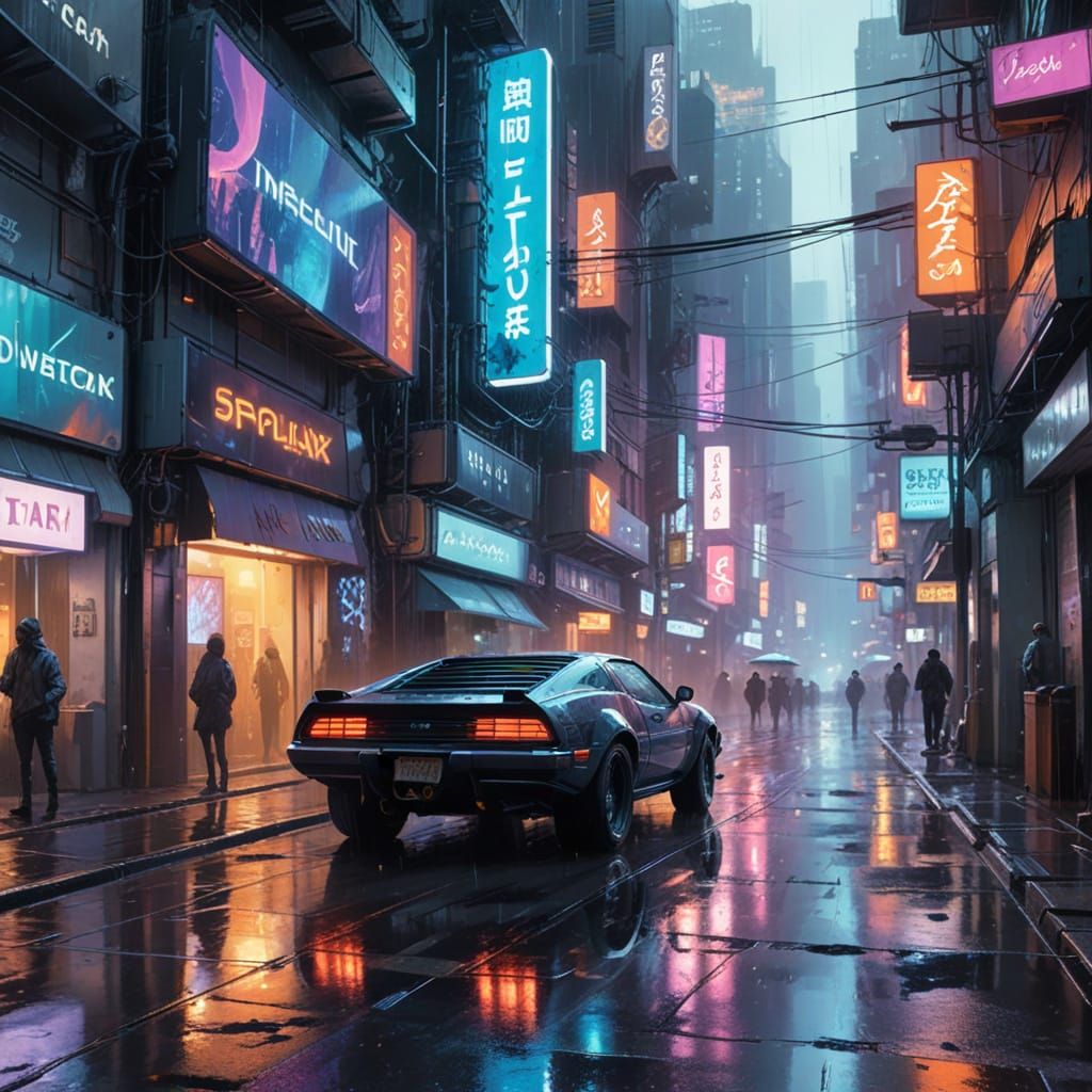 This image shows a futuristic cyberpunk alleyway at night, slick with rain and glowing with neon signs. It blends a digital art aesthetic with watercolor techniques.