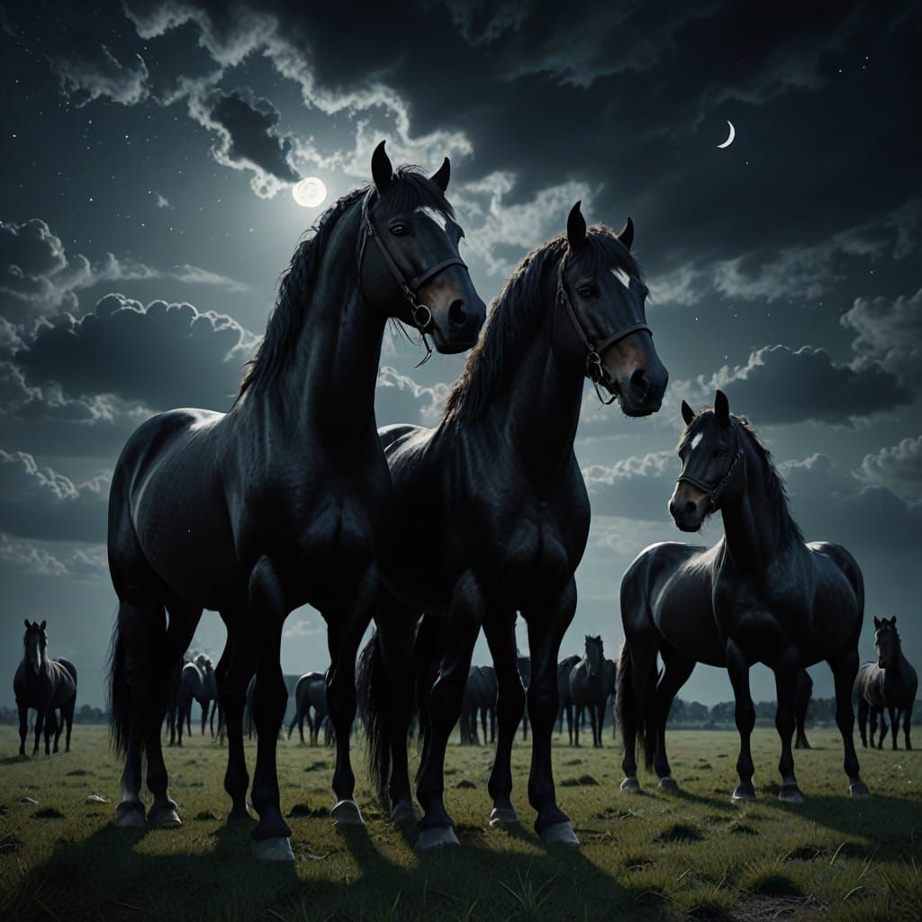 A cinematic image shows powerful black Balkan horses in a moonlit pasture. Silver reflections highlight their coats, set against a mystical, high-contrast night scene.