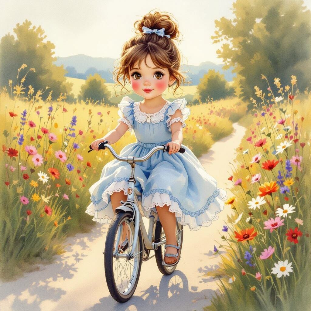 A charming illustration of a young girl with golden-brown hair riding a bicycle through a wildflower field. The scene is bathed in warm sunlight, rendered in a delicate watercolor aesthetic.