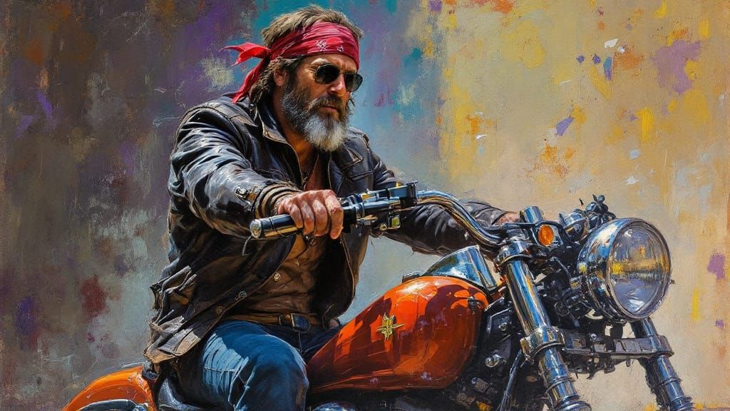 This image features a weathered biker with a bandana, rendered with bold brushstrokes and dramatic lighting. It blends classical composition with impressionist immediacy and fluid texture.