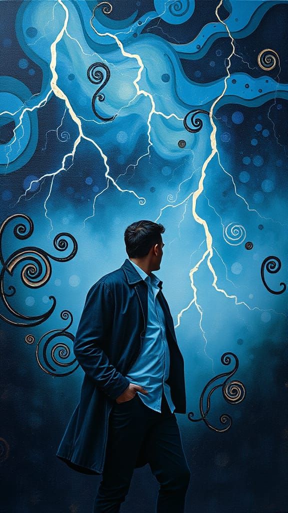 Implications of Love Lost Again and Again Pablo Picasso contrasting colors deep color cubism impressionism modern art filigree quilling oil on canvas soft focus 3D shading complex elaborate holographic intricate iridescent spiraling serene thunderstorm Male Men