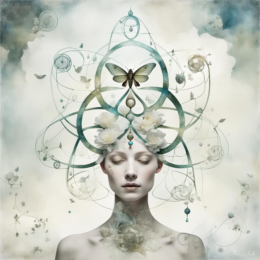 This image shows an intricate, semi-abstract alchemical symbol design in a whimsical and ethereal style. The artwork features serene colors and a matte finish, set against a graceful white background.