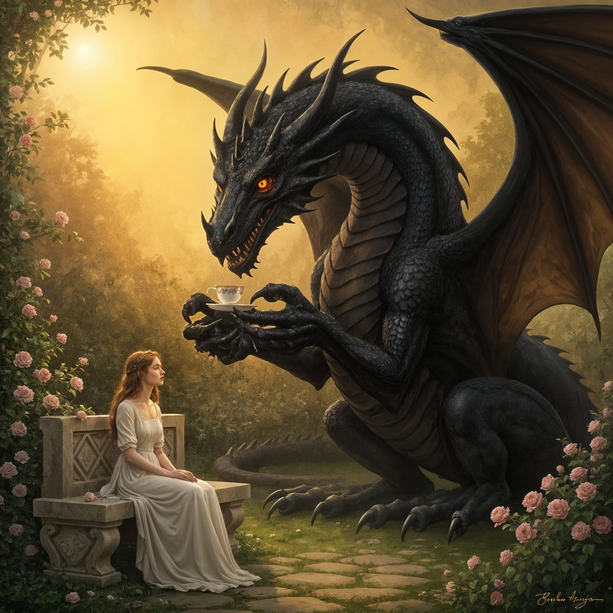 This image shows a black dragon with amber eyes carefully serving tea to a maiden in an enchanted garden. The Pre-Raphaelite style oil painting is rich with jewel tones and romantic brushwork.