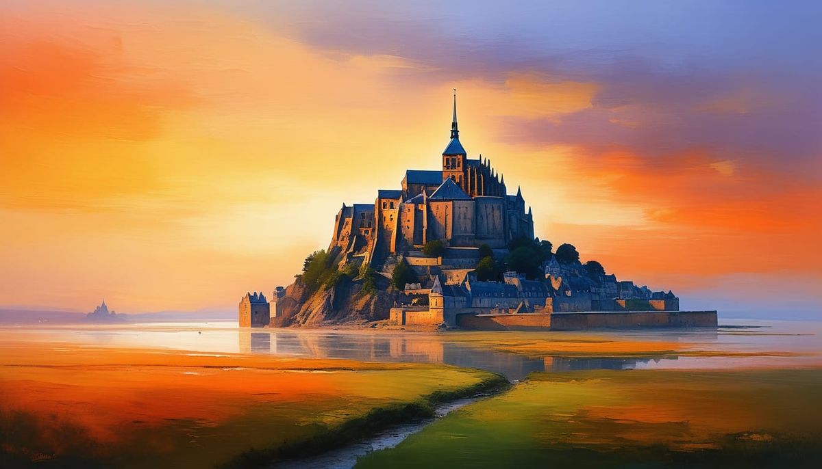 A stunning image capturing a sunset over Mont Saint Michel in an impressionist style. The oil painting uses vibrant orange brushstrokes, golden light, and a soft background.