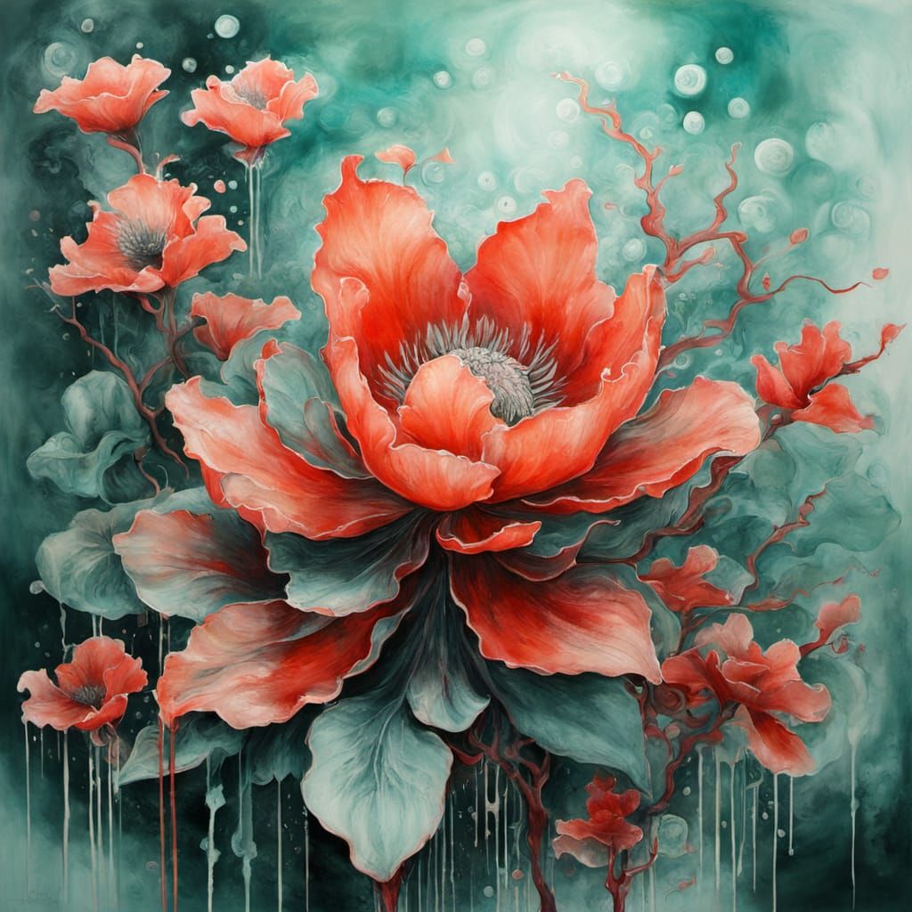 This abstract painting features vermilion jade tones with a wet wash technique, creating a surreal floral composition with subtle light dust accents.