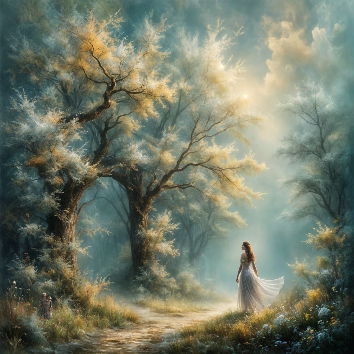 This image is a dreamy representation of a princess shrouded in mist, featuring ethereal and magical elements.