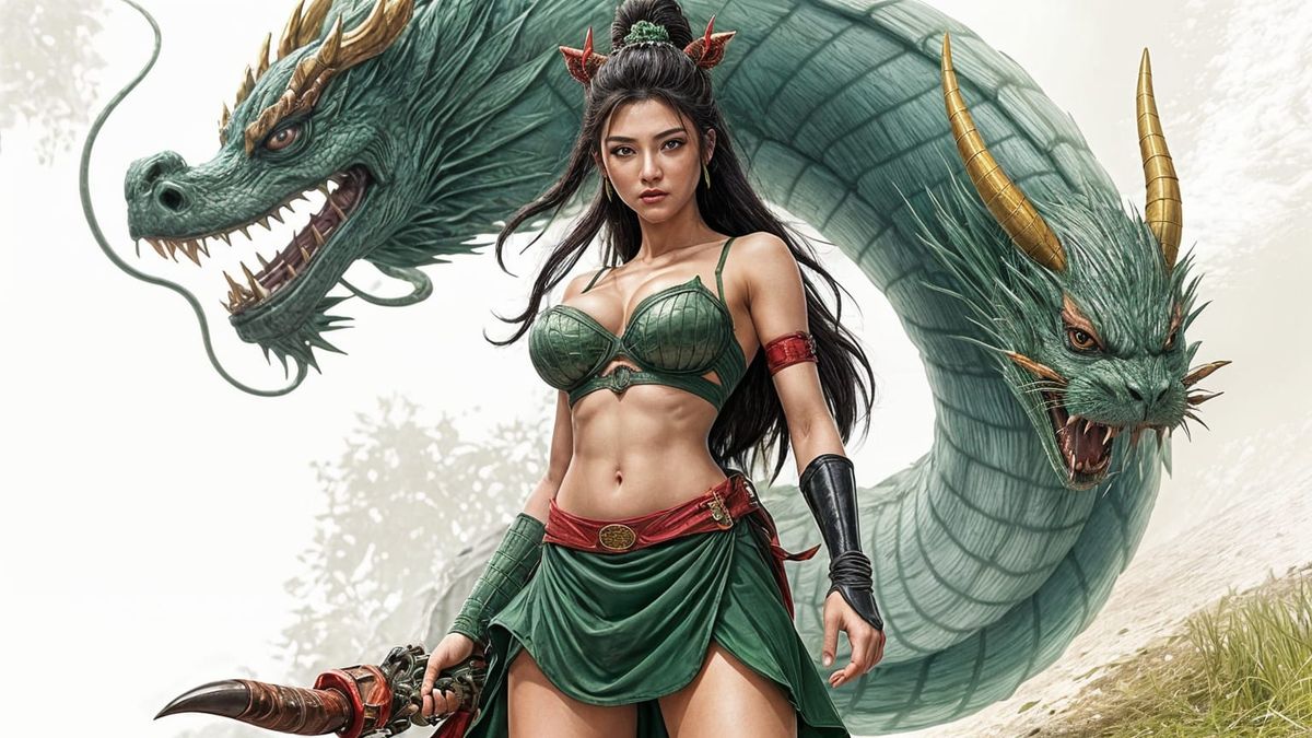This image shows a powerful, beautiful, and muscular Chinese warrior woman standing tall with a short skirt and a fierce expression, facing a dragon with green eyes.