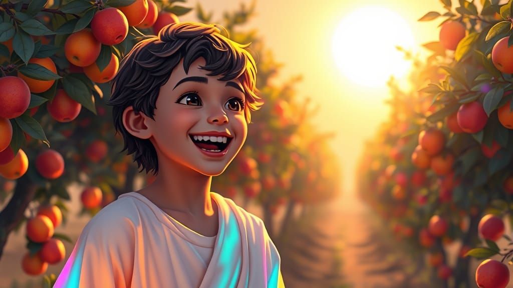 This image depicts a youthful Jesus walking through a serene ancient orchard, marveling at rainbow-colored fruit under a radiant golden sun, in a style reminiscent of cyberpunk illustrations with vibrant, detailed graphics.
