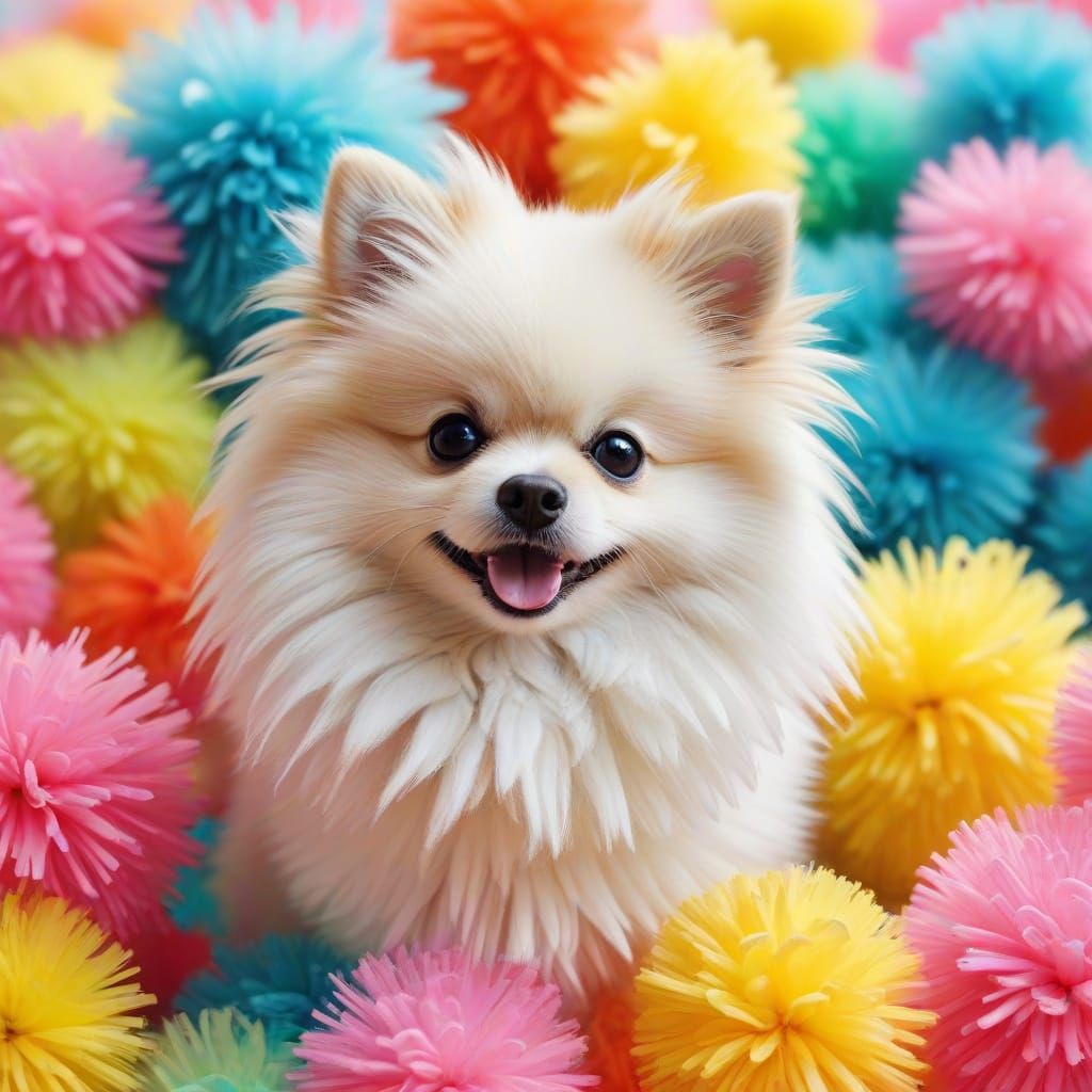 A close-up image of adorable pets wearing colorful pom poms, rendered in a playful watercolor style. The image features soft natural lighting and a pastel-colored background.