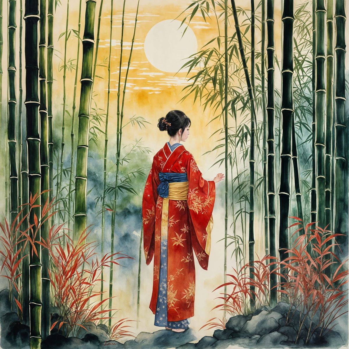 This serene image shows a young Japanese woman in a misty bamboo forest, bathed in warm golden light at dawn, in a style reminiscent of watercolor and delicate ink details.