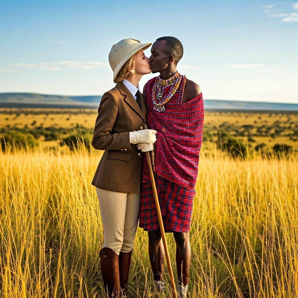 A beautiful British aristocrat shares a passionate kiss with a Maasai warrior in the heart of the Kenyan savanna, surrounded by vibrant grasses and acacia trees, in a stunning colonial-inspired scene.